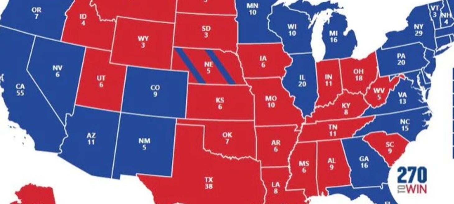 This map, based on current polls, shows Biden with a lead of 351 electoral votes to Trump’s 187. Picture: 270 to Win